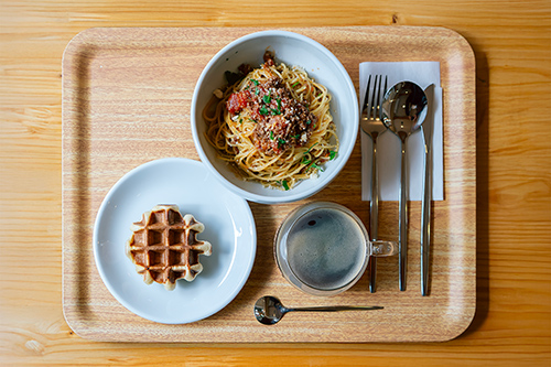 Aランチ(自家製ミートソースパスタ+ワッフル1種+ドリンク1種)